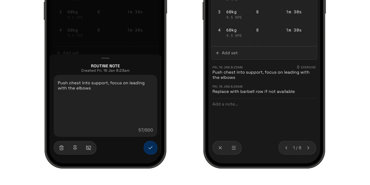 Every lifter trains differently, and these flexible notes bridge the gap between our data tracking and your unique style. Whether it's a specific seat setting or a mental "click" during a set, you now have a dedicated space to record it.