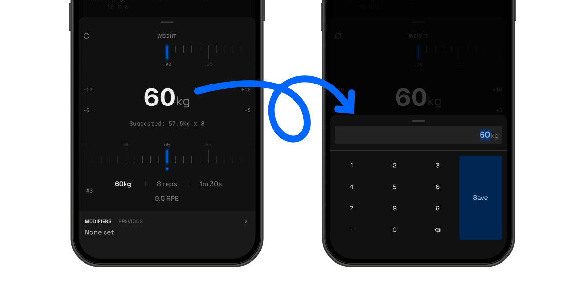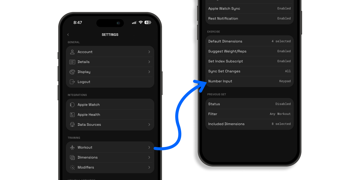 âď¸Quick Tip: You can switch to the number pad as your default selector in the settings via Training > Workout > Exercise > Number input. An entry point has also been added during an active workout via the options in the footer for easier configurations.