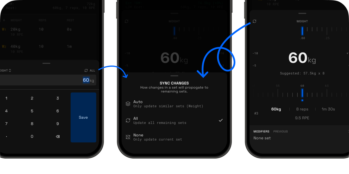 All remaining sets: Made a big jump in weight? Use this to instantly update every set left in that exercise with a single tap. No more repetitive typing.
